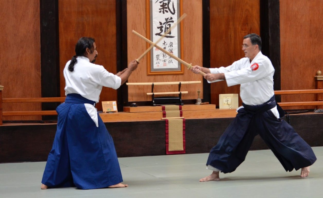 Aikido has its technical roots in the subtle grappling arts of Aiki-Jujitsu together with the elegant forms of combat sword (Kenjitsu) and combat Staff, ( Jodo). We study traditional Japanese solo sword and staff forms, Aikido weapons disarming techniques and interactive weapons work such as those practiced by the samurai warriors of the past. Our test requirements include extensive work with Kumitachi (sword-on-sword), Kumijo (staff-on-staff) and weapons-disarming. We also practice other combinations of weapons, such as staff or knife with sword, as well as two-sword techniques and multiple attacks with weapons. Throughout our goal is to embody basic principles of Aiki, or unity. At Redlands Aikikai we practice weapons exclusively during our Aikido Weapons class, and most of our regular classes include weapons work. We also do one-day weapons seminars, and weapons practice is usually featured as an aspect of all our seminars.