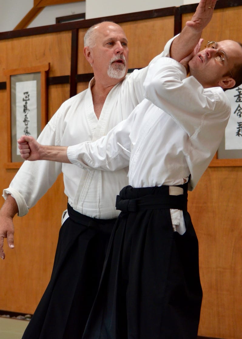 We begin with warm-ups, breathing exercises and stretching, all expressing Aikido principles, followed by practice in safely rolling on the mat. Techniques are then practiced with partners and there is usually included some solo or partner weapons work. The intensity of the class ranges from a slow, contemplative study to a challenging cardiovascular and mental workout. Class ends with cool-down stretching and breath-work.